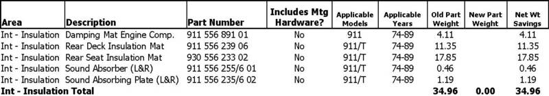 http://forums.pelicanparts.com/porsche-911-technical-forum/425369-lightweight-interior-firewall-sound-heat-pad.html $89 so about £65 not too bad but have to factor in shipping. Only weighs 2lbs !! that’s a huge saving over the 13kg OEM padding. Its die-cut so no mincing around cutting to fit. Im pretty tempted to go for one. May see how easy my current one will come out first. Other options are using Dynamat extreme at 1.1kg per metre squared or Second skin audio soundproofing. Probably cheaper but more time consuming to lay and cut. Be nice to know the actual efficiency of the newer soundproofing compared to the OEM old worn out stuff. Sprightly 1134kg and falling. |